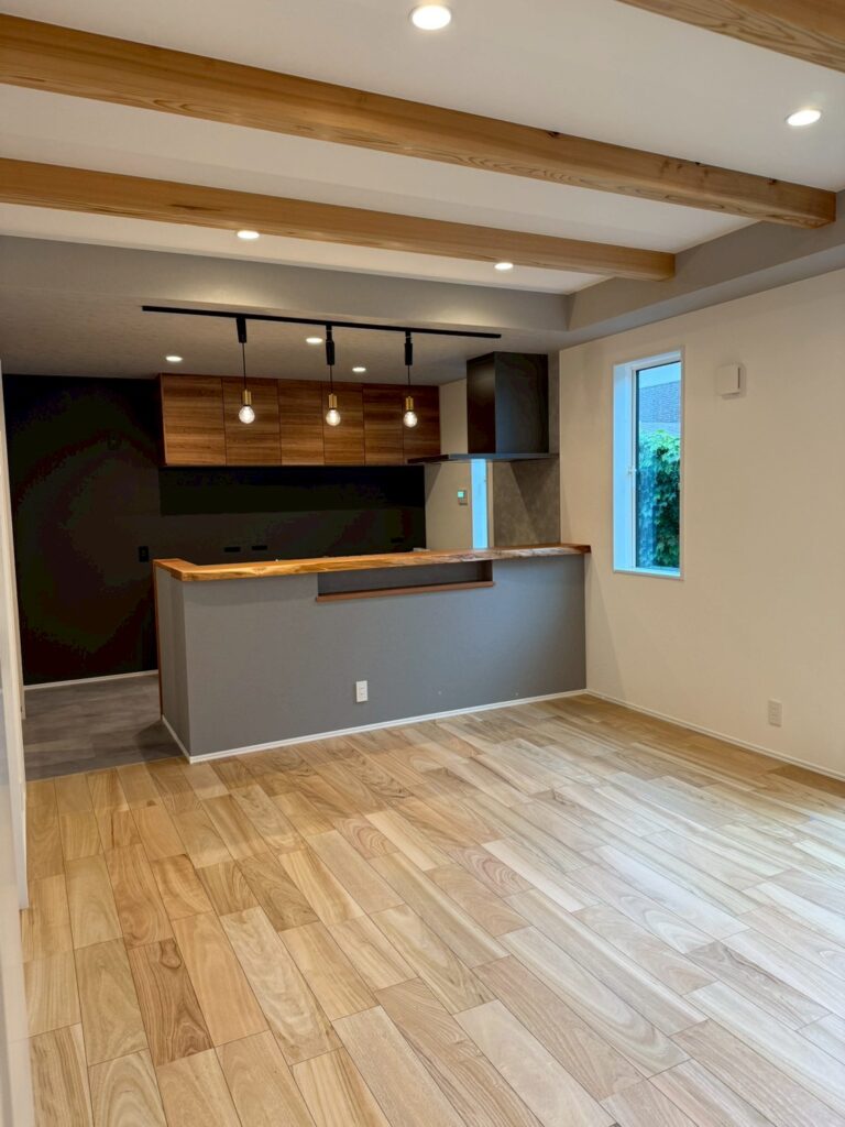 突板のフローリングと天井の梁の雰囲気が素敵です